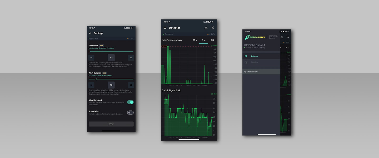 This application is designed to work with the GP-Probe Nano L1, transforming it into a powerful real-time GNSS interference analysis tool. The app provides live visualization, faster jammer localization, flexible configuration options, and lays the foundation for advanced operational modes coming soon.
