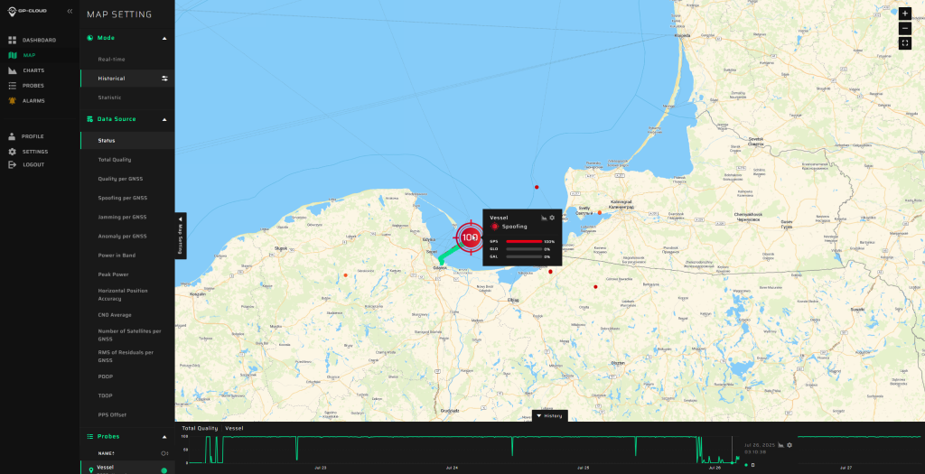 Our shipborne GNSS interference sensor remains fully active on the research vessel, continuously collecting real-time data in the Gulf of Gdańsk. If you would like to see current interference conditions near the Kaliningrad maritime border, we can provide live demonstrations during an online meeting.